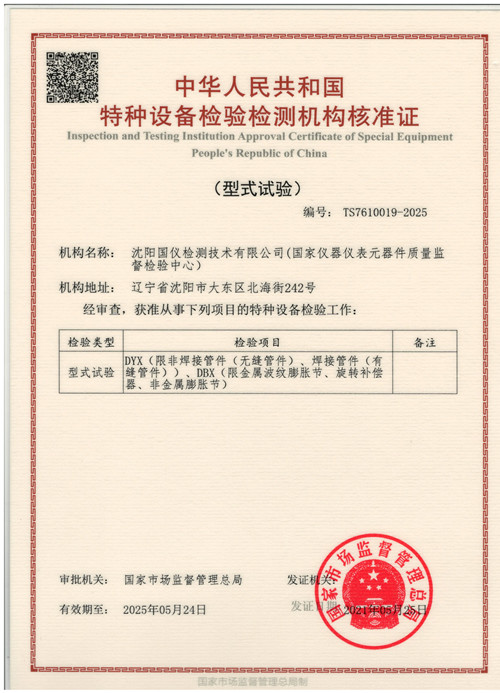 經(jīng)國家市場監(jiān)督管理總局審查,獲準從事DYX(限非焊接管件(無縫管件)、焊接管件(有縫管件))、DBX(限金屬波紋膨脹節(jié)、旋轉補償器、非金屬膨脹節(jié))特種設備型式試驗檢驗工作。